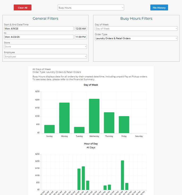 The Busy Hours Report helps you analyze when your business is most active throughout the week. It displays the volume and value of orders by day and time, providing insights into customer traffic patterns.