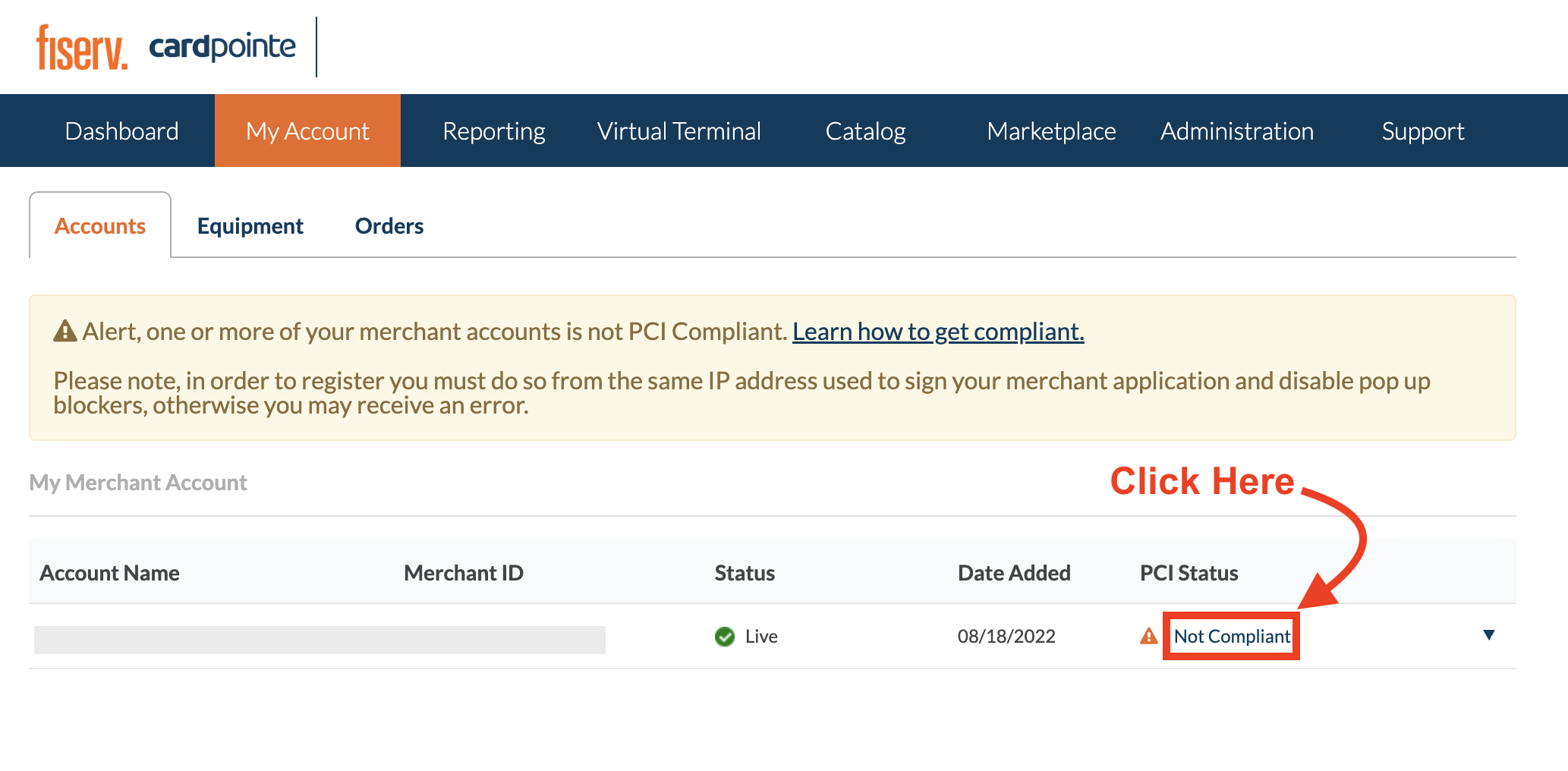- If you see an alert message about not being PCI Compliant, then click the “Not Compliant” link as shown in the picture above.