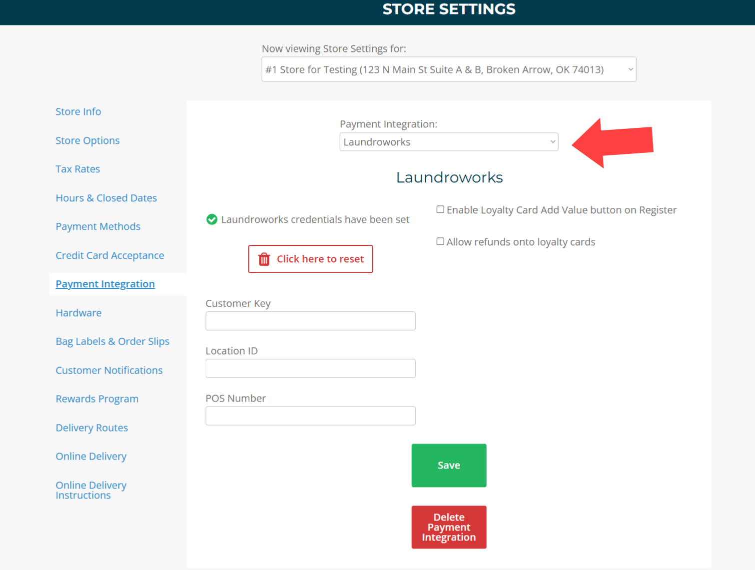 Click the Payment Integration tab. Select Laundroworks from the dropdown menu.