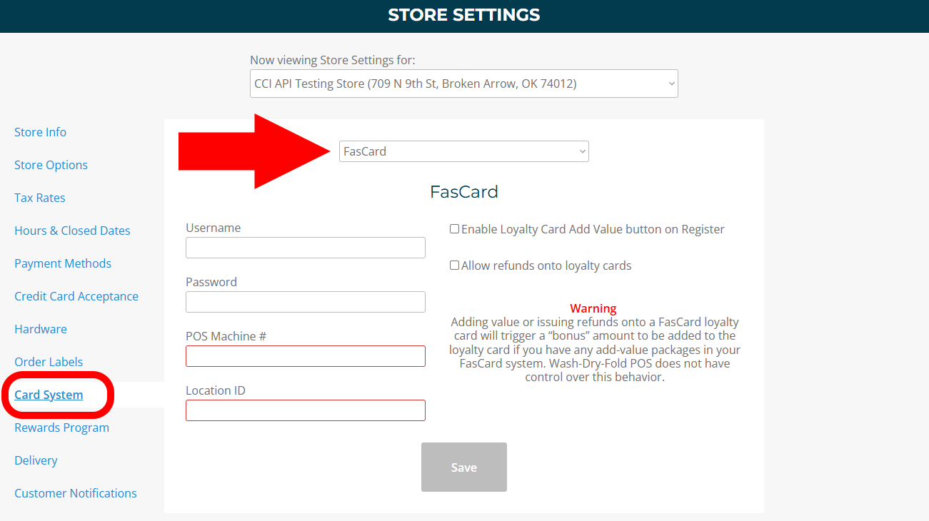 Click the Card System tab. Select FasCard from the dropdown menu.