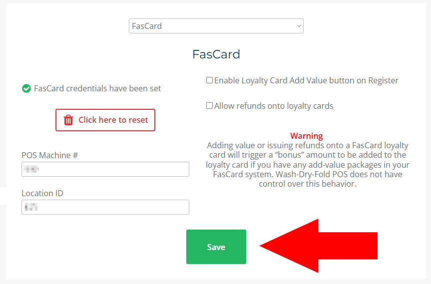 Enter all the information you collected and wrote down from the FasCard admin site. Click the Save button, and you are done!