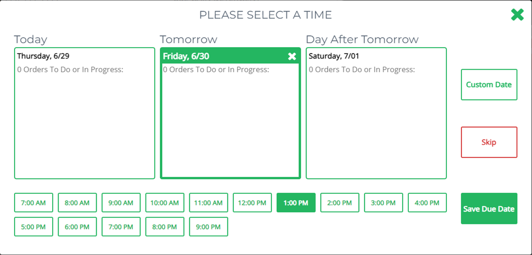 Setting an Order's Due Date To Set a Due Date: Choose a preset date or click Custom Date for more options. Select both date and time before clicking Save.