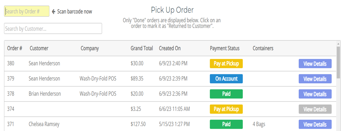 - The system will display all orders marked Pay at Pickup (highlighted in yellow).