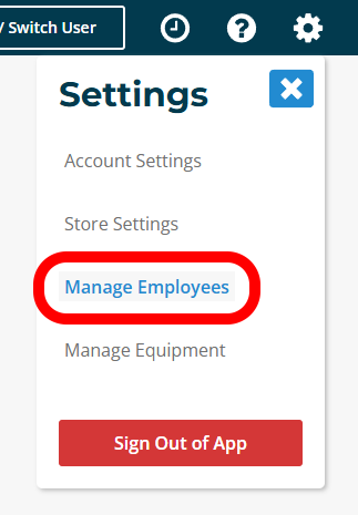 Click the gear icon in the top right corner of any page of Wash-Dry-Fold POS. Select Manage Employees from the options that appear.