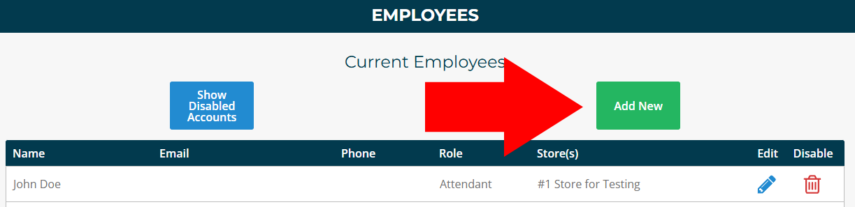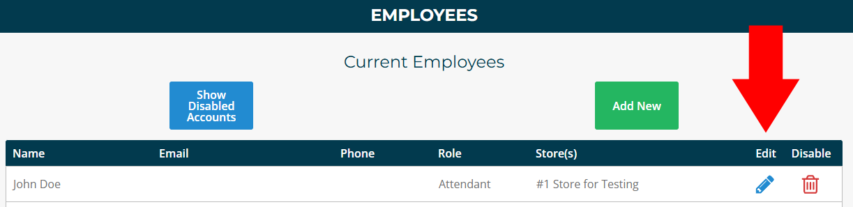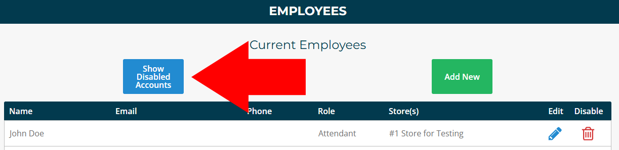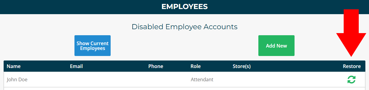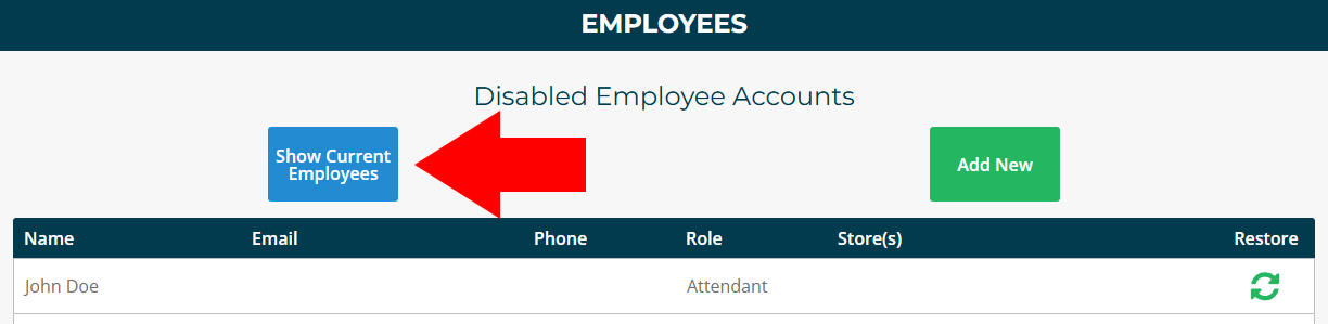As previously mentioned in the Disable Employee warning message, you must add access to any relevant stores and set this employee's PIN again now that they are restored. If they are an employee with a role that requires an email and password, you must add those again as well. Click the blue Show Current Employees button to return to the list of current employees and edit the restored employee.
