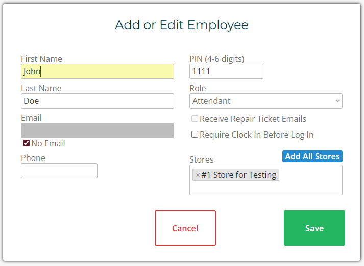 - Email (only if the employee's Role requires an email, otherwise No Email can be checked)