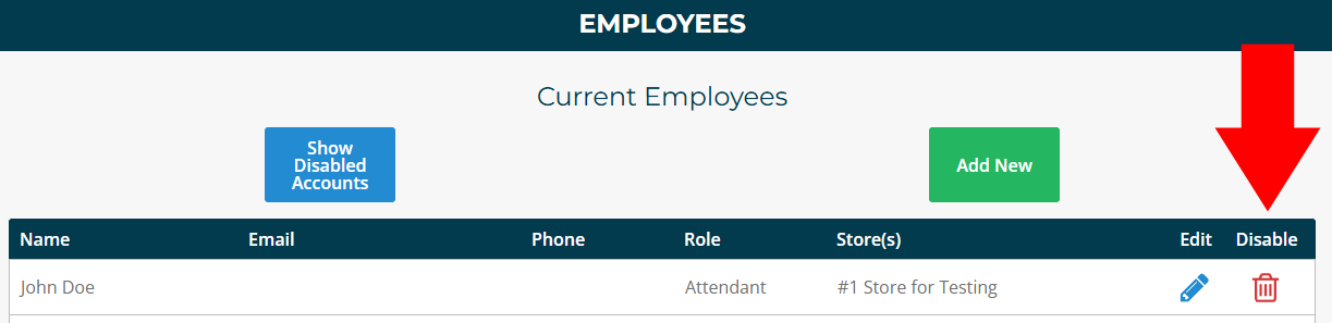 Click the red trash can icon in the Disable column to disable an employee's profile.