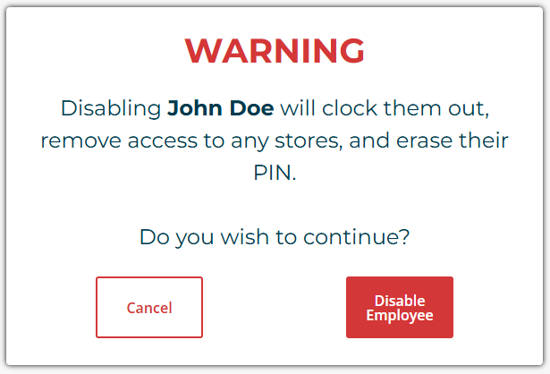 Please note the displayed warning message, which warns that disabling the employee will clock them out, remove access to any stores, and erase their PIN. Click the red Disable Employee button to confirm.