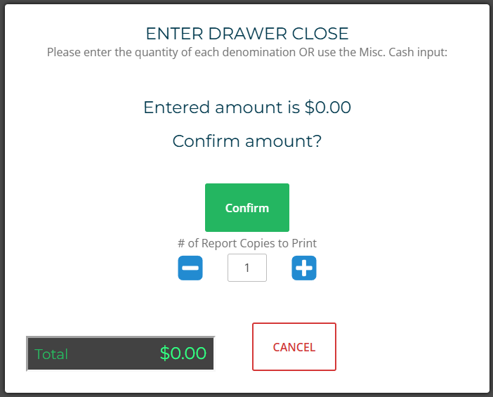 Click Confirm and print a Shift Report receipt (+ button increases copies).