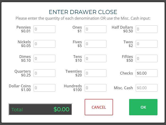 Enter Ending Cash Drawer Amount. Click OK.