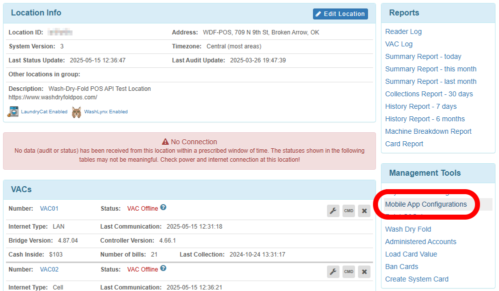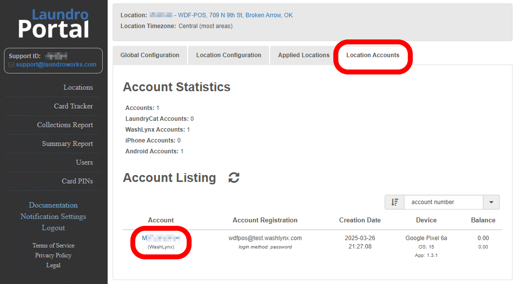 On LaundroPortal, navigate back to the Mobile App Configurations page and click the Location Accounts tab. The WashLynx app account number should now appear in the Account Listing section.