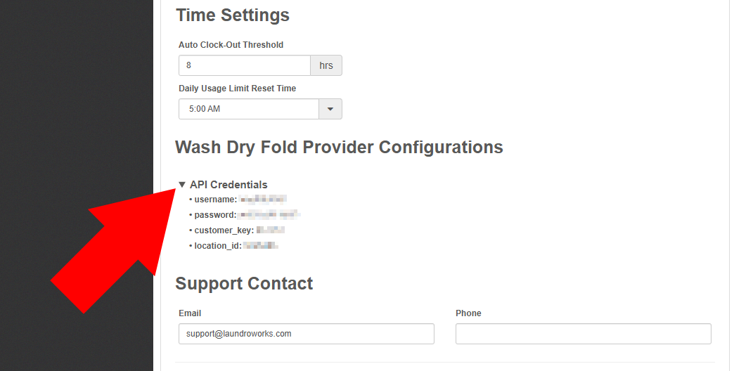 On the Location Configuration tab, scroll down to the Wash Dry Fold Provider Configurations section and click the triangle next to API Credentials to view.