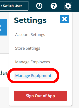 Click the gear icon in the top right corner of any page in Wash-Dry-Fold POS. Select Manage Equipment from the options that appear.