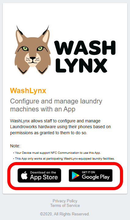 Download and install the WashLynx app on your phone through the iOS App Store or Google Play Store. Follow the on-screen instructions to bind the app account to your location.