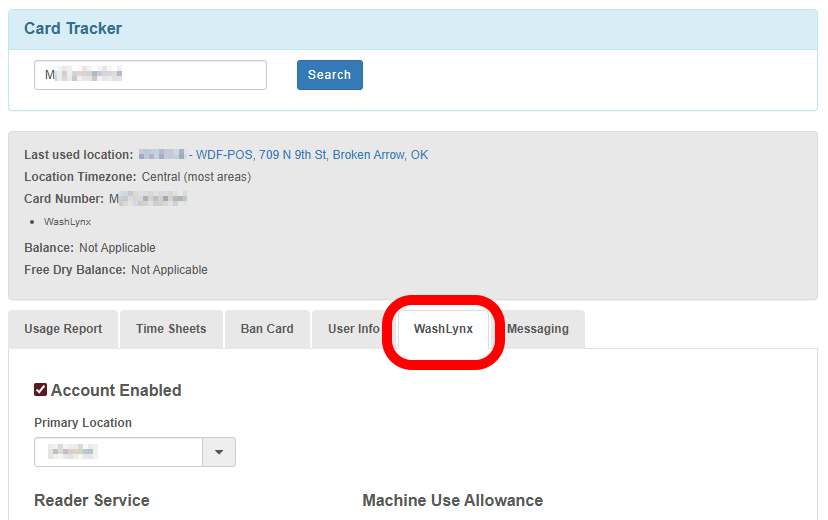 Click the account number to view details, then click the WashLynx tab to edit permissions for this WashLynx app account. Click the blue Save button at the bottom of the page when you are done.