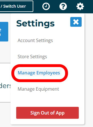 Click the gear icon in the top right corner of Wash-Dry-Fold POS. Select Manage Employees from the options that appear.