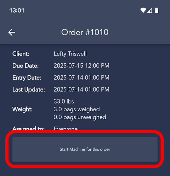 Once WashLynx has been integrated into Wash-Dry-Fold POS, attendants can use the WashLynx app on their mobile devices to select a laundry order from a list synchronized with Wash-Dry-Fold POS and initiate machine starts for that order with their mobile device. The machine start information will automatically update within Wash-Dry-Fold POS.