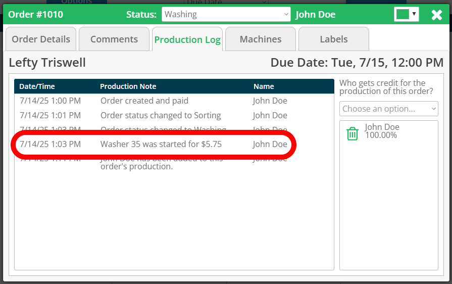 WashLynx will sync machine start info with Wash-Dry-Fold POS. The start will be attributed to the assigned employee (as detailed in Part 6). If the WashLynx account was not assigned, the start will be attributed to the person who handled the order last on the Order Tracker.