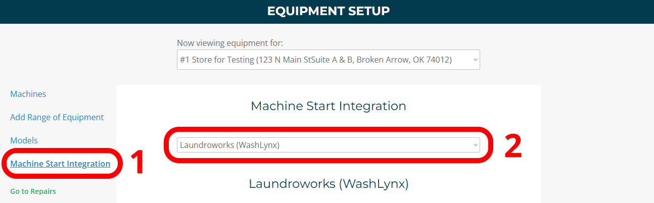 Click the Machine Start Integration tab and select Laundroworks (WashLynx) from the dropdown list of integration partners.