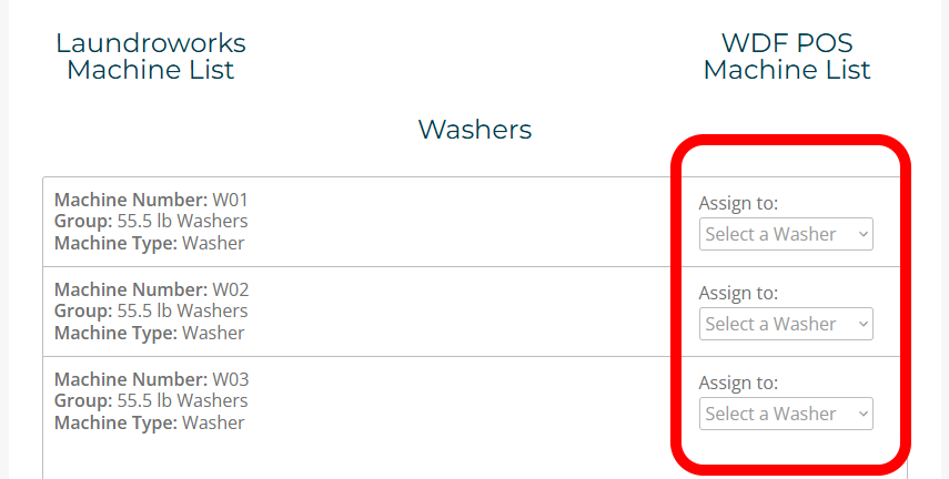 Stay on the Machine Start Integration tab. Select the correct WDF POS machine in the Assign to dropdowns for each Laundroworks machine.