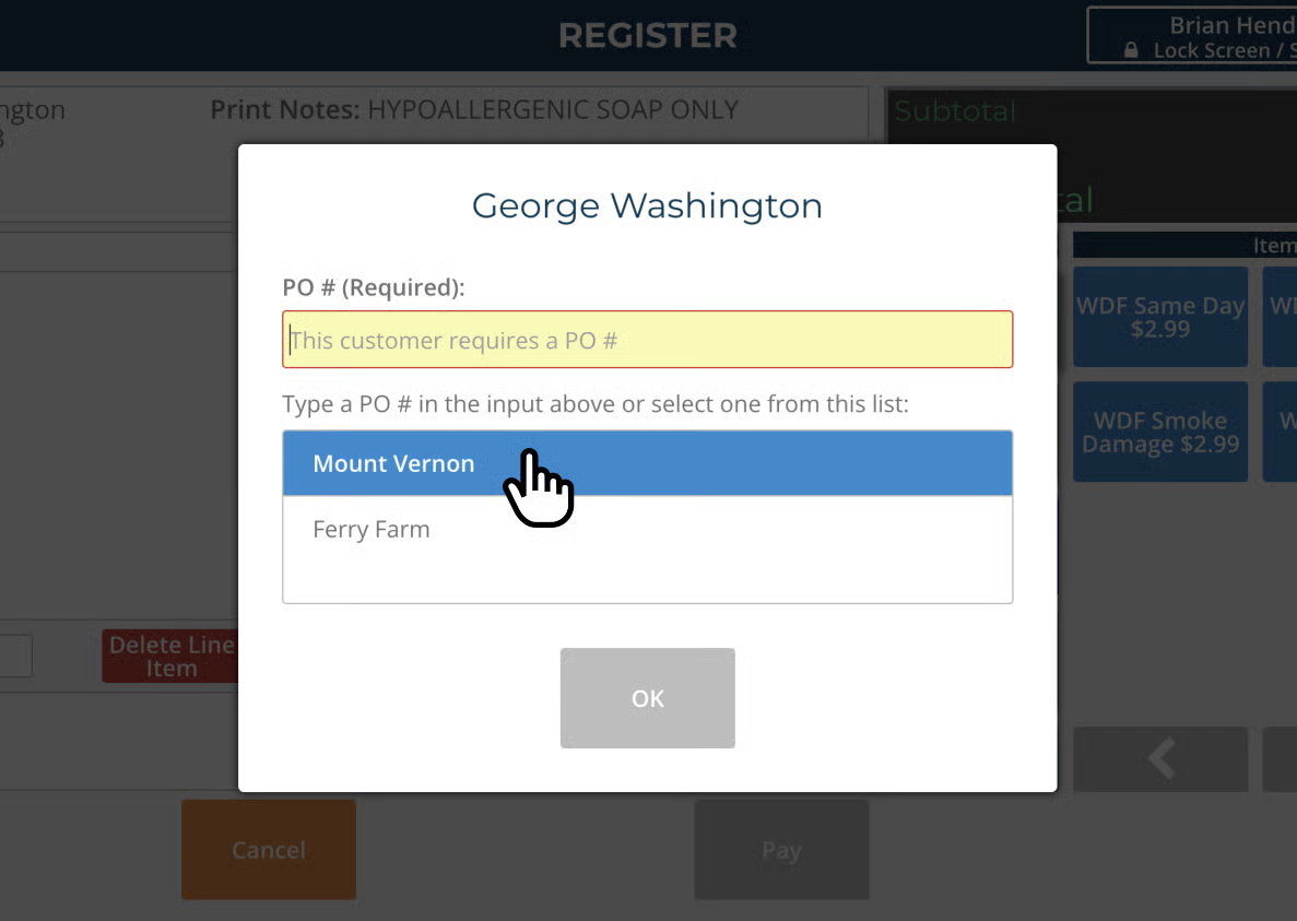 When you start a new order for a customer with subaccount or PO number presets saved to their profile, the system will prompt you to select one of the saved values. This ensures each order is properly categorized and linked to the correct PO or subaccount.