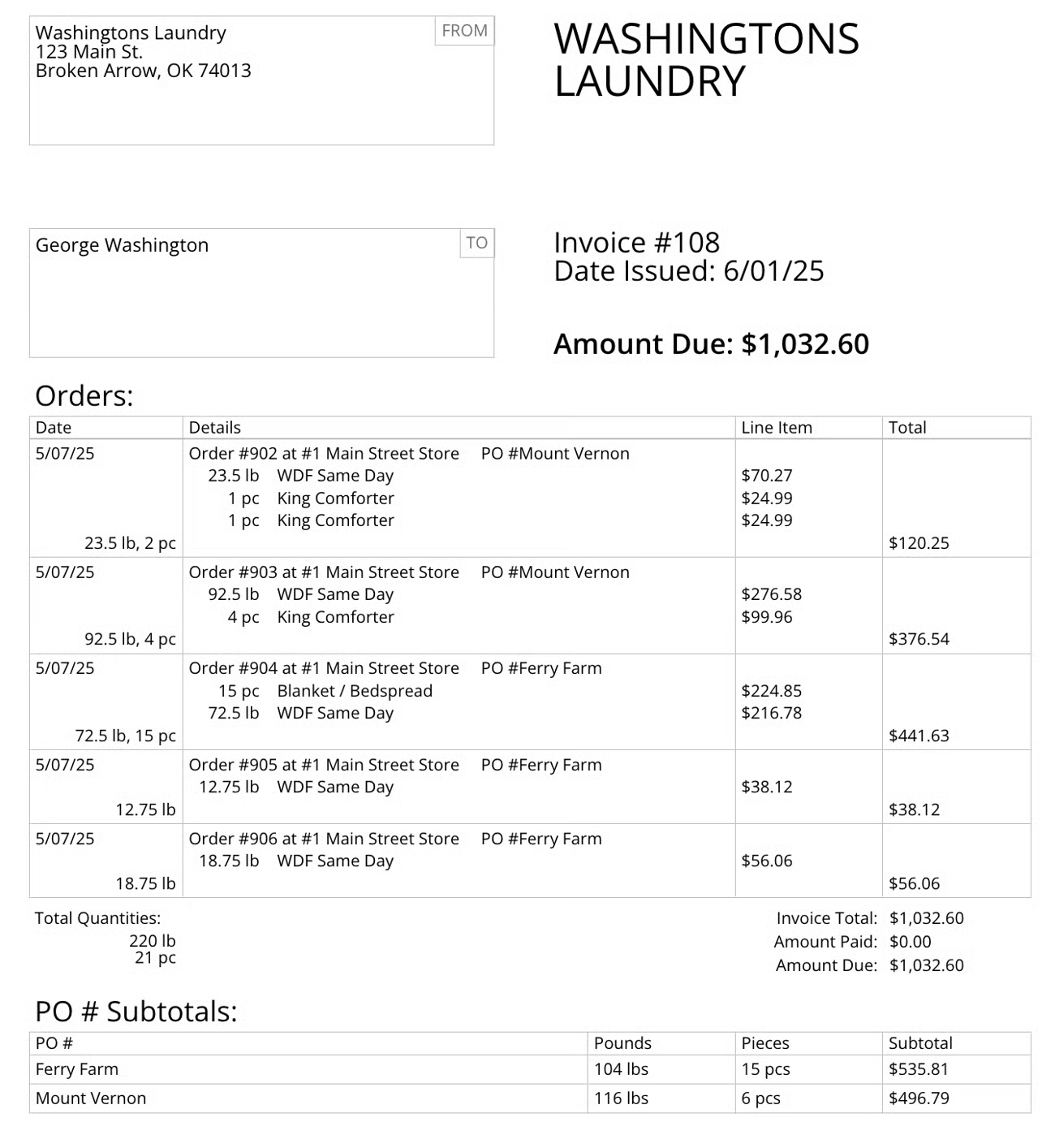 For On Account customers, if orders have PO numbers assigned, those orders will be grouped by PO # at the bottom of the invoice when it is generated. This makes it easier for your customers’ accounts payable departments to reconcile charges.