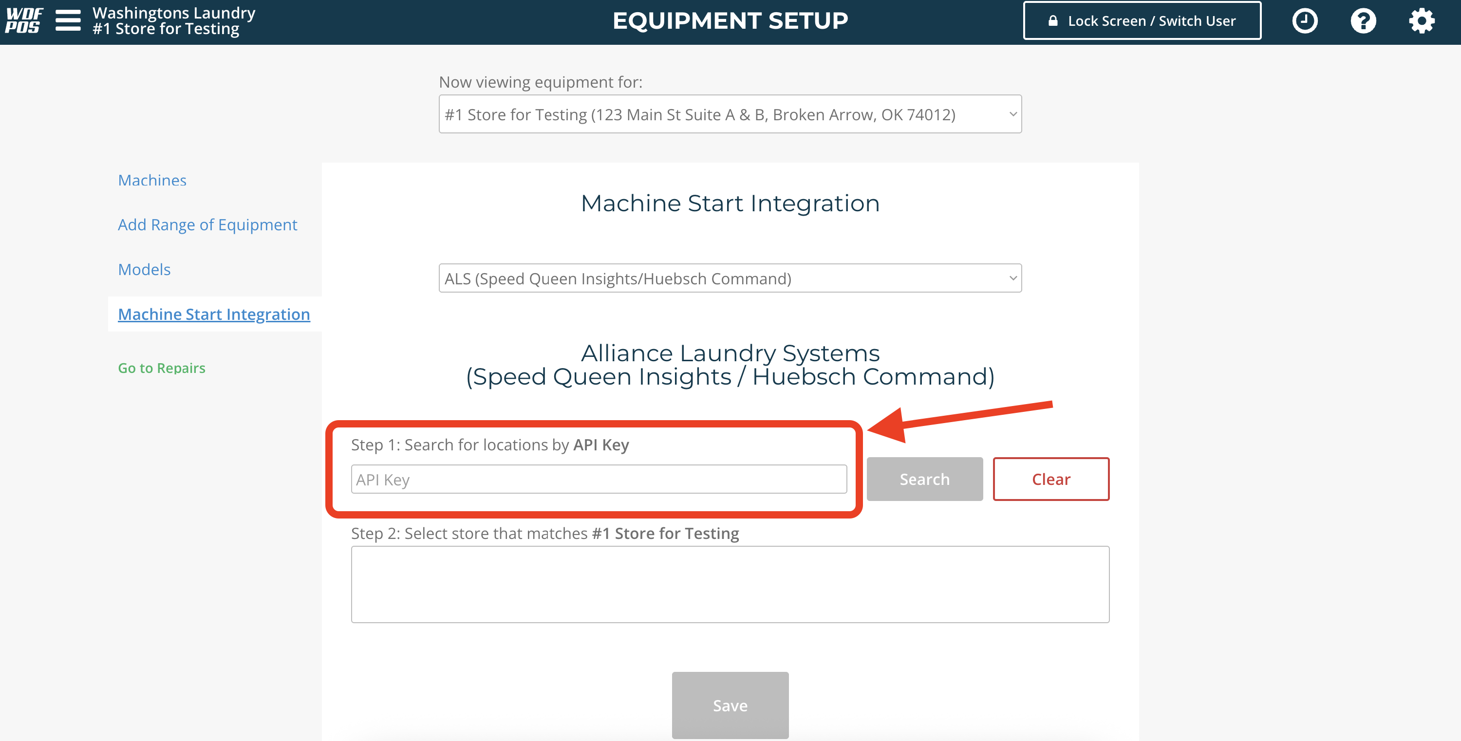 - Copy and paste your API key provided by Alliance Laundry Systems.